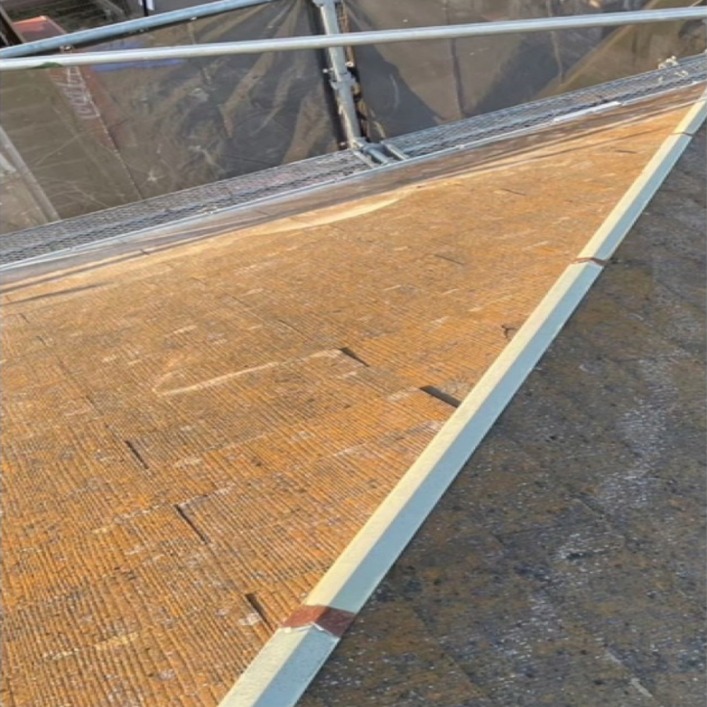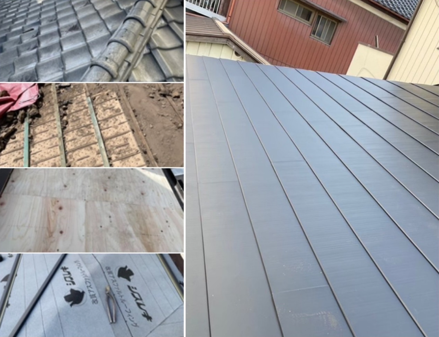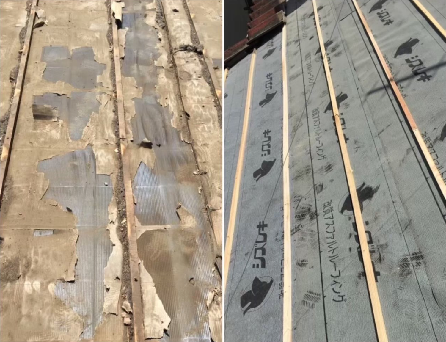 Y様邸の屋根を担当させていただきました。古くなったスレート屋根の上から軽量金属板(ガルバリウム鋼板)の屋根材を被せて、スレート屋根の完全葺き替えに比べて古いスレートの解体工事や廃材処理が不要です。このため、施工コストを抑えられ、短い工期でリフォームを完了できました。